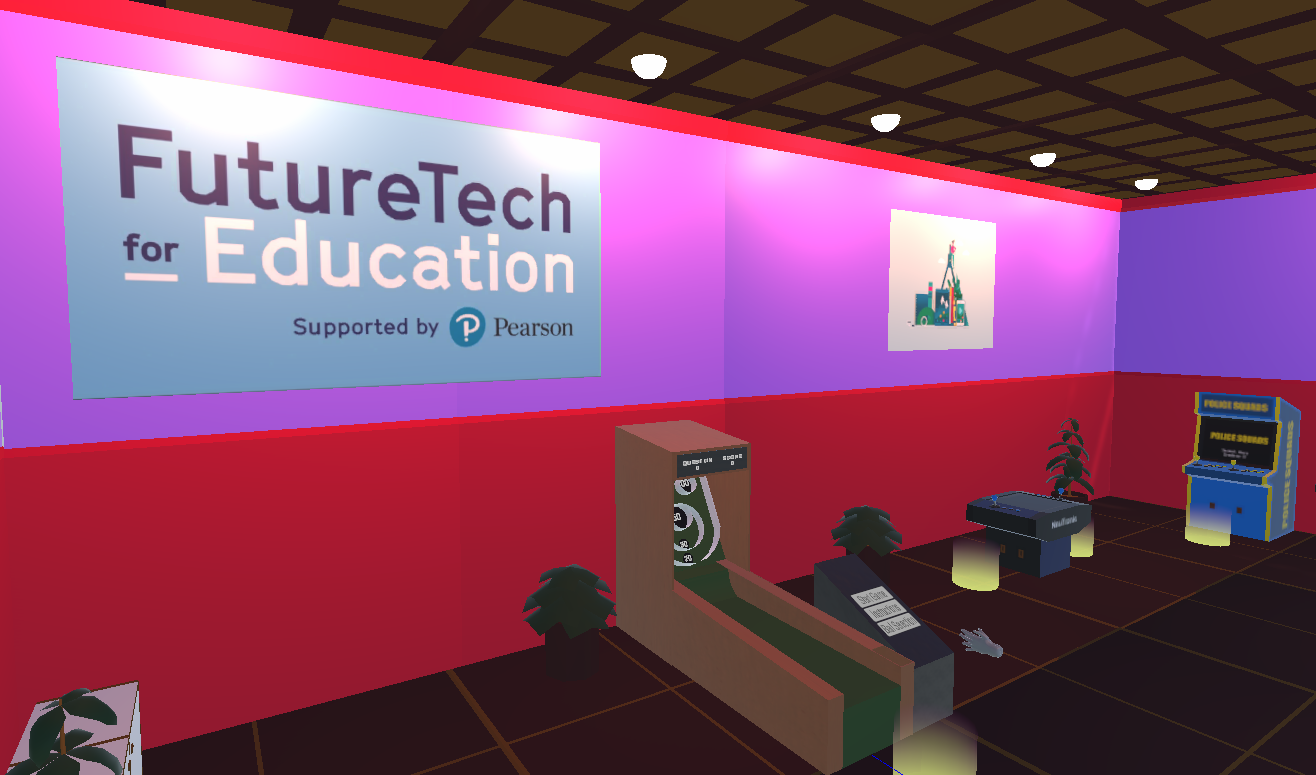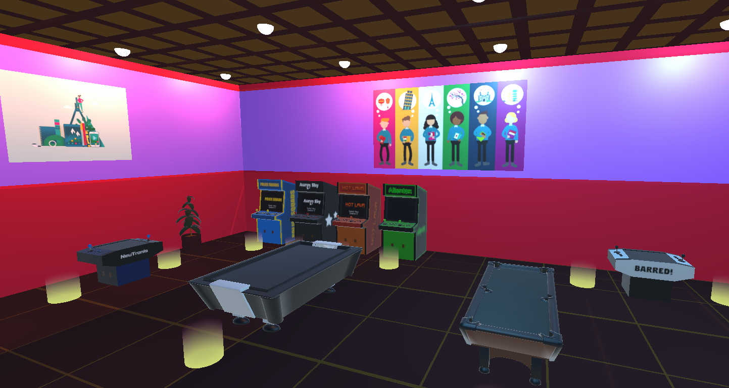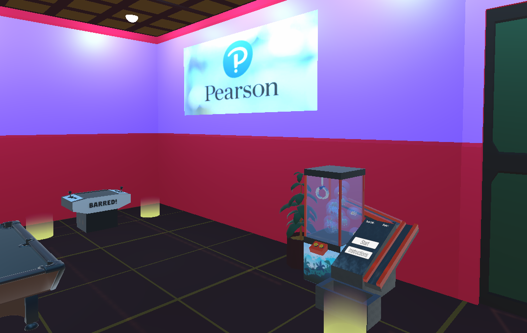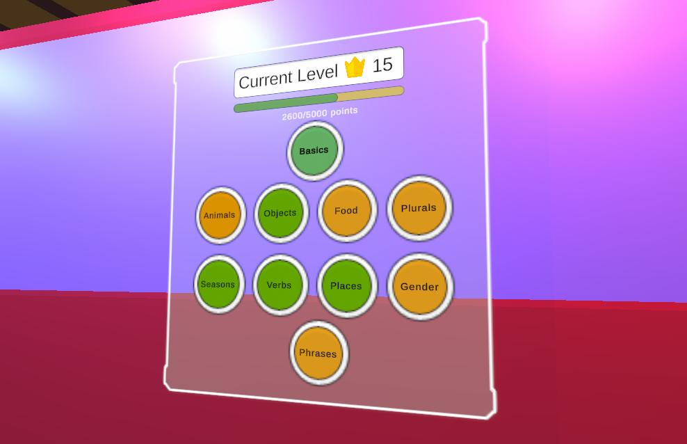 This is a virtual reality (VR) arcade room in which the player can learn a language while also playing a variety of different minigames. The player progress through levels, each of them composed of several modules based on different language topics, for example, parts of speech such as verbs, or more general topics like seasons of the year or common phrases.